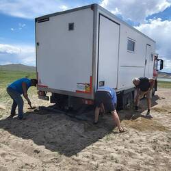 Gerd, Wolfgang und Adrian fuhren nach Ulan Bator, um direkt vor Ort bei einer Mercedes Garage die benötigten Schritte und Ersatzteile für die beiden Pannenfahrzeuge zu organisieren. Wann unsere Mitreisenden wieder mit uns unterwegs sein werden, steht noch in den Sternen. Der nächste wichtige Termin ist am 26.7. an der Mongolisch- Chinesischen Grenze. Dazwischen liegt die Wüste Gobi.