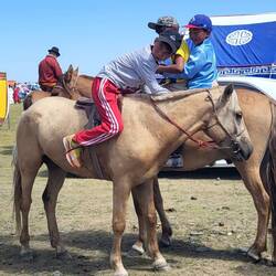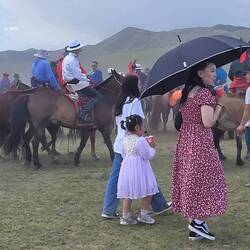 Bereits beim Frühstück standen wir mit unseren Wohnmobilen quasi mitten im Geschehen. Aus allen Ecken schwärmten die Menschen zum Festgelände herbei. Auf Pferden, zu Fuss, per Moped oder Auto. Immer eine grosse Staubwolke hinter sich herziehend. Naadam ist das grösste Fest für Mongolen. Das Volksfest und Nationalfeiertag dauert drei Tage und findet meistens vom 11.7. - 13.7. statt. Das Naadam Fest zelebriert die Nomadenkultur