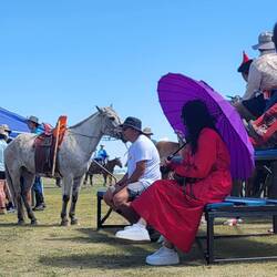 Etwas neben der Einzäunung standen die wertvollen Rennpferde etwas gelangweilt angebunden herum. Der Züchter deckte jedes Einzelne mit einem Umhang zu. Seine beiden Söhne halfen ihm dabei. Beide mit einem Chupa Chups im Mund. So schön, wie die Schwester geteilt hat. Diese Pferde sind festgebunden, damit sie nicht zu viel fressen. Der Umhang soll die Funktion einer " Sauna" erfüllen. So bleiben sie unter anderem schlank und rank für die Pferderennen. Während diesen Vorkehrungen sass Nyama mit seiner Pferdekopfgeige musizierend daneben. Was für eine schöne Stimmung.