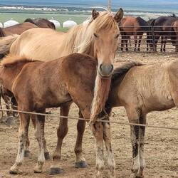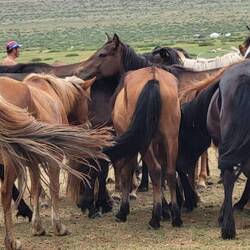 Für den heutigen Morgen hatten wir ein Rendez-vous mit einer Nomadenfamilie zwischen 11.00 und 12.00 Uhr, in ihrer "Gästeempfangs-Jurte". Die sechsköpfige Familie lebt das ganze Jahr hindurch in diesen zwei Behausungen. Im Sommerhalbjahr wechselt sie ihren Standort nach drei Monaten für neuen Weidegrund. Die Familie lebt von der Pferdezucht. Sie besitzen 10 Hengste. Für jeden Hengst gibt es 20 Stuten. Wieviele Fohlen noch dazu kommen, hat uns der stolze Züchter nicht verraten. Wir verraten ja auch nicht unsere Kontostände jedermann. 😉