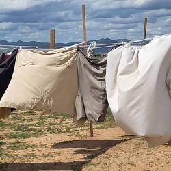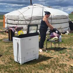 Als wir zurück zu unserem Lager kehrten, hing unsere Wäsche bereits zum Trocknen unter der mongolischen Sonne. Die Wäscherei vom Jurten Camp hat diese Arbeit für uns übernommen. Ein Luxus der Sonderklasse.
