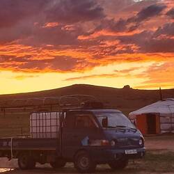 Das Fahrzeug konnte nicht vor Ort repariert werden. Es wurde aus dem 600 Km entfernten Ulan Bator ein Abschleppwagen organisiert. Gaby und Gerd verbrachten die Nacht in ihrem Bimobil am Strassenrand, neben einer mongolischen Kneipe, während wir bei einem Lagerfeuer ruhig den Tag ausklingen liessen.
