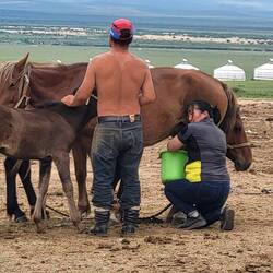 Bevor die Stuten gemolken wurden, durften die Fohlen zuerst noch bei ihrer Mutter Milch trinken.
