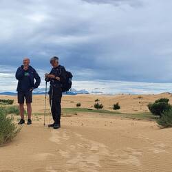 Die Wolken hingen tief über der Wiesen-, Steppen- und Sanddünenlandschaft. Um zehn Uhr trafen wir in Wanderkleidung vor dem Teamfahrzeug ein. Peter überzeugte mich zuvor, dass Bewegung auch mir gut täte anstelle von Blogschreiben oder malen.