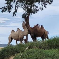 Bei den Dünen gab es eine stündige Mittagspause, die wir für weitere Erkundungen nutzten. Die Kamele liessen sich dabei nicht stören und frassen genüsslich Blätter von den mongolischen Birken.