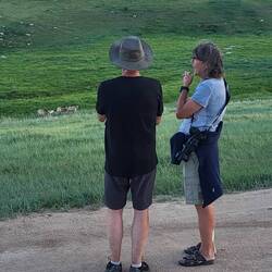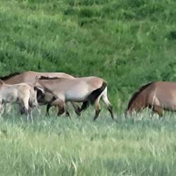 Am Abend trafen wir uns alle vor dem Eingang in das Naturschutzreservat. Bevor es mit zwei russischen, geländegängigen Bussen auf die Abendpirsch ging führte Nyama die ganze Gruppe durch das Infozentrum des Hustai Nationalparkes und stellte bei einem kleinen Filmvortrag die Entstehungsgeschichte dieses Nationalparkes vor. Der Hustai Nationalpark ist für die erfolgreiche Wiedereingliederung der noch einzigüberlebenden Urpferdeart, des mongolischen Takhi weltweit bekannt. Unter enormem Aufwand gelang es 1992 - 2000 niederländischen und mongolischen Forschern, 84 Takhis in den Hustai Nationalpark, zu bringen. Dank eines gut geplanten Wiedereinführungsprogramm wuchs die Herde bis 2023 auf 402 Pferde an. Die Pferde leben in völliger Freiheit, im Ursprungsgebiet. Im Hustai Nationalpark lebt die grösste Takhi Herde weltweit. Das Takhi Pferd ist auch unter dem Namen des russischen Forschers Przewalski bekannt. Er konnte beweisen, dass das Takhi die einzige noch lebende Urpferderasse ist. Früher lebten in der Mongolei viele Takhis. Sie wurden ihres Fleisches wegen beinahe ausgerottet. Heute sind sie geschützt.