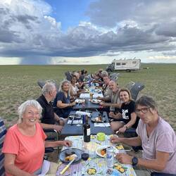 Pünktlich zur abgemachten Zeit erschienen wir Reisenden mit Tisch, Stuhl und Gedeck. Das Essen unter dem mongolischen Abendhimmel mundete vorzüglich. Das Ziegenfleisch war gabelzart und " böckelte" überhaupt nicht. Die Kartoffeln, Karotten und der Weisskabis passten wunderbar dazu.
