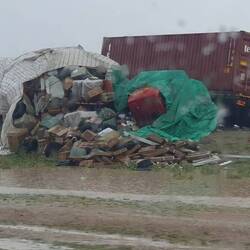 Meldung von Ingrid: " 3 Kilometer vor dem Abzweig kurze Umleitung über die Piste." Als wir zu dieser Stelle kamen herrschte Chaos. Zwei Lastwagen schienen einen Unfall verursacht zu haben. Ein Anhänger mit Wagenladung lag quer über der Fahrbahn. Viel Zeit blieb nicht, um sich gross zu ängstigen. Das Lenkrad fest umklammert steuerte ich unser Hüttli über das Bord hinunter und versuchte so gut wie möglich einem PW zu folgen. Wenn der durchkommt, schaffen wir das auch..."Gring abe und fahre". Peter neben mir hielt sich fest am Haltegriff und schrie mir die Orders durch: "Rechts, nein links, gib Gas, nicht so schnell, ja nicht stehen bleiben..." Giotti fuhr durch Riesenpfützen, über Geröll, durch Schlamm und als I-Tüpfelchen ein steiles Bord hinauf, damit wir wieder auf der Strasse waren. Unser Adrenalinspiegel lag ziemlich hoch. Einige Lastwagen blieben im Schlamm stecken.