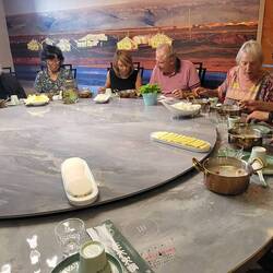 Zu Fuss machten wir uns auf den Weg in die Stadt und trafen auf Ruth und Jean-Claude. Mit viel Gestik und Google Translater kamen wir zu einer Restaurantempfehlung. Der nette Herr begleitete uns bis dorthin. Danach gings von vorne los: Handy, Google Translater, Text übersetzen, Bestellung aufgeben, hoffen, dass wir richtig verstanden wurden....ein sich wiederholendes Szenario, seit wir in China sind. Ganz wichtig für mich auch die Erwähnung "nicht scharf". 😉