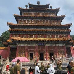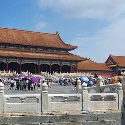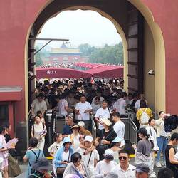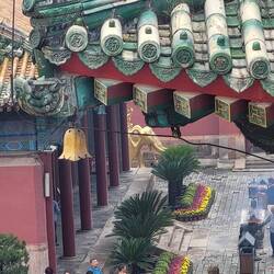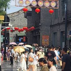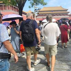 Wir zogen über den Platz in Richtung des Südtores weiter. Es trägt den überschwenglichen Namen "Tor des Himmelsfriedens". Hier hängt Pekings einziges Mao-Porträt. Das Tor führt in die "Purpurne Verbotene Stadt". Der eigentliche Name des Palastes ist "Zijincheng". Purpurn sind die mächtigen Umfassungsmauern, die ihm den Charakter einer Festung verleihen. " Verboten" hiess er, weil niemand ausser dem Kaiser Zugang hatte. Erwachsene Prinzen erhielten Residenzen ausserhalb. 24 Kaiser residierten hier. Erbaut wurde die Anlage von über 200'000 Arbeitern zwischen 1406-1421. Der Kaiserpalast mit 8600 Räumen gilt weltweit als der Grösste. Nach dieser Besichtigung ging es zuerst einmal 20 Minuten zu Fuss weiter, zur Haltestelle, wo uns der Bus abholte. Die Fahrt führte uns ins touristische Downtown mit Fussgängerzone. Vorallem für Souvenirs und Fast Food war vorgesorgt. Die Zeit reichte, um ein Fleischdumpling und ein Glacé auf der " Rambla " zu essen und dabei die in Ferienstimmung herumschlendernden Massen zu beobachten.