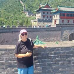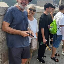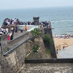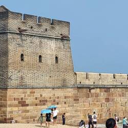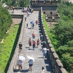 Als Zwischenziel wurde uns für heute Badaling mit der Grossen Mauer empfohlen. Es liegt ungefähr 60 Kilometer nordwestlich von Peking, oder Bei Jing auf chinesisch. Schon von weitem sahen wir eine Blechlawine, die sich langsam zum Grossparkplatz hin bewegte. Es ist das am stärksten überlaufene Stück der Chinesischen Mauer. Die Restauration der Mauer erfolgte bereits in den 1950er Jahren. Die Mauer läuft hier an der Nordseite eines 660 m hoch gelegenen Passes entlang. Klar, dass Peter bis zum ersten Wehrturm hochlaufen wollte. Dies bei beinahe 40°C. Mir reichte ein kleines Stück des Weges.
