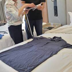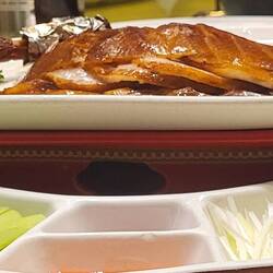 Zurück im Hotel wechselten wir schnell die Kleidung, damit wir etwas frischer für die bevorstehende "Peking Ente" waren. Ein reichhaltiges und sehr leckeres Nachtessen mit der berühmten Ente wurde uns da gereicht. Viel Zeit blieb uns auch hier nicht. In der Hotel Lobby warteten bereits die Schneiderin und ihr Gehilfe mit unseren Kleidern. Im Zimmer probierten wir die massgeschneiderten Kleider und das Shirt an. Die sehr schön verarbeiteten Kleider werden vorerst sorgfältig verräumt. Da der Halsausschnitt vom Shirt etwas zu eng geschneidert war, wurde es nochmals zurück ins Atelier genommen. Das seidigglänzende Shirt wird uns ins Hotel nach Xi'an geändert nachgeschickt. Ich hab der Schneiderin nicht verraten, dass mir das Shirt gut sitzt und Peter es mir geschenkt hat. Es ist ihm zu feminim...