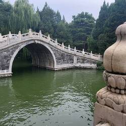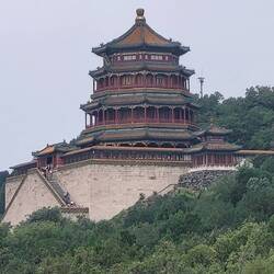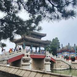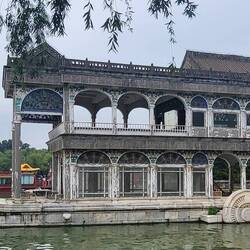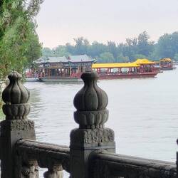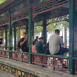 Per Bus zogen wir um 8.30 Uhr zum Sommerpalast Yihe Yuan. Wir waren nicht die einzigen, welche sich zum Eingang bewegten. Schwülwarme Temperaturen liessen unsere Schweissdrüsen arbeiten. Die Wolken hingen sehr tief am Himmel. Es war eine Frage der Zeit, wann diese platzen würden. Eine riesige Parkanlage empfing uns. Der Garten zur Pflege des Altersfriedens, meist als Sommerpalast bezeichnet, ist weder Festung noch Konkubinenkäfig, sondern grün, geräumig, überaus vielgestaltig, oft sogar vergnüglich. Gedacht war er nicht als Kaiservilla, sondern als Witwensitz. Heute erscheint die Anlage 16 km nordwestlich des Stadtzentrums vor allem als ein Wunderwerk der Landschaftsarchitektur. Sie wird von zwei Merkmalen beherrscht: vom Kunming-See, der mit den anschliessenden Wasserflächen gut drei Viertel des Gartens einnimmt.