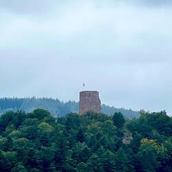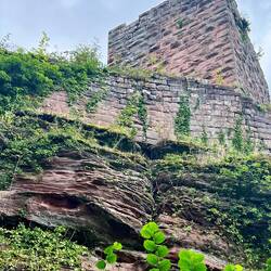 Hier oben geht es beinahe touristisch zu, so ist im Burghof neben einer kleinen Kapelle, ein Restaurant für den hungrigen Besucher untergebracht. Kurzerhand besteige ich über eine schmale Treppe die Burgruine, genieße einen verregneten Ausblick ins Elsass und verschwinde wieder im Wald.