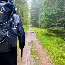 Nachdem wir, atmosphärisch bedrückt, wieder Waldboden unter den Sohlen haben, regnet es der Stimmung entsprechend unaufhörlich weiter. Nichts desto trotz laufen wir, Schritt für Schritt, unsere 35 Kilometer Etappe bis zum Odilienberg, der Dauerregen ist dabei zwar ein Wermutstropfen, aber kein Hindernis.
