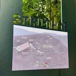 In der Nähe des Hotels ziehen die Nazis ein Dutzend Baracken hoch, die als provisorische Unterkunft für die ersten Deportierten dienten. Von diesem Basislager aus müssen sie die Straße bauen, die Terrassen anlegen und die Lagerbaracken hochziehen. Bei dem Gasthof gibt es auch Garagen und eine Wäscherei für die SS-Leute. Um den Gasthof herum wird später Stacheldraht gezogen, und es werden Wachtürme errichtet.