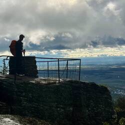 Nach anfänglichen Navigationsproblemen laufen wir über wunderbare Singletrails zur Aussichtsplattform Maennelstein. In der Ferne, tief unter uns, zeigen sich Elsass und Rheinebene in mystische Nebelschwaden gehüllt in einem ganz besonderen Licht.