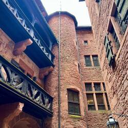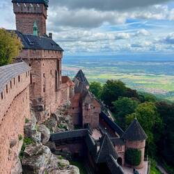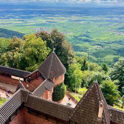 Haut-Koenigsbourg aus dem 12. Jahrhundert. Eine unter Kaiser Wilhelm dem II. restaurierte und als Museum für das deutsche Rittertum geplante Anlage. Auch wir gönnen uns eine Besichtigung und lassen uns von Mittelalterphantasien in den Bann ziehen. Als wir unseren Weg fortsetzen machen sich die Schmerzen am Schienbein von Bananagirl immer stärker bemerkbar.