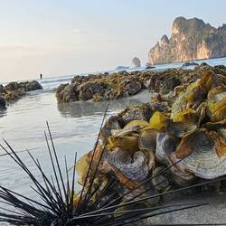 Koh Phi Phi Don bietet unzählige Wassersportarten und hat zwei sehr große Buchten mit geringem Wellengang. Auch sehr besonders ist das Wirken der Gezeiten. Gleich an unserem ersten Tag werden wir Zeuge der starken Ebbe. In wenigen Stunden verschwand das Meer vor unseren Füßen und zog sich fast aus der gesamten Bucht heraus. Im ersten Moment wussten wir gar nicht, dass es hier Gezeiten gibt. Deshalb hatten wir kurz Panik, dass es sich bei dem Rückgang des Wassers um einen Tsunami handele. Wir beobachteten wie die Einheimischen sich jetzt verhalten und erkennen schnell, dass sie ins Watt los ziehen um Muscheln vom Grund zu sammeln. Alles Ok.