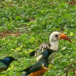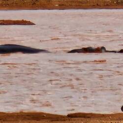 Mittagspause in der Aruba Lodge. Das Buffet ist so lecker wie vielfältig! Beim Essen bekommen wir Besuch von ein paar Eidechsen und es gibt hier gar nicht scheue Dreifarbenglanzstare. Die sehen wunderschön aus mit ihrem blauen Gefieder! Justine hat sie schon im Park gesehen. Sie verhalten sich genau wie die Spatzen zu Hause. Kaum steht man vom Tisch auf fliegen sie auf den Tisch und dinieren so vorzüglich wie wir. 😀. Außerdem kamen noch ein Wiedhopf - der wie ein Zebra gestreift ist - und ein Savannentoko vorbei! Dies ist ein vom Aussterben bedrohter Vogel! Und genau der gleiche wie Zazoo on König der Löwen. Nach dem Essen gehts wieder auf die Pirsch. Unsere Gesichter sind schon ganz rot, weil wir während der Fahrt stehen und den Sand abkriegen! Plötzlich bremst der Fahrer an einem Wasserloch. Es dauert ne Weile bis wir den vermeintlichen Baumstamm als Nilpferd identifizieren. Erst als er ein Stück weiter aus dem Wasser guckt erkennt man ihn. Das gefährdete Nilpferd ist Vegetarier. Ich sehe auf der weiteren Fahrt auch ein Erdmännchen, außer dem jeder Menge weiterere Antilopen, Gazellen auch viele Vögel, für die wir leider nicht stehen bleiben. Z.b. Kampfadler, Aasgeier und ganz kleine Schwärme, die sich gleich in den Sträuchern verstecken wenn wir kommen. Leider haben wir an diesem Tag keinen Löwen und auch keine Giraffe gefunden. Für den Löwen müssten wir viel früher losfahren sagt Jackson. Und schon ist die Fahrt durch den Nationalpark zu Ende.