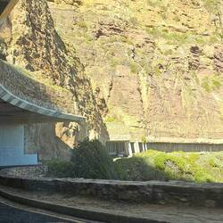 den Einheimischen liebevoll “Chappies” genannt wird. Sie ist eine der spektakulärsten Küstenstraßen der Welt. Gern nutzen Autohersteller wie BMW die Kulisse für ihre Werbespots. Die Route startet im kleinen Fischerort Hout Bay und schlängelt sich steil hinauf bis zum Chapman's Point, der nächsten Station unseres Ausflugs. Unterwegs gibt es zahlreiche Parkbuchten mit Aussichtspunkten, von denen aus man den Atlantischen Ozean bewundern kann. Hier machen wir einen Fotostopp. Waseem erzählt, dass der Chapman's Peak Drive Austragungsort zweier, beliebter Sportveranstaltungen ist: die Cape Town Cycle Tour und der Two Oceans Marathon. Der Bau des Chappies begann 1915. Wegen herabfallender Felsen war die Straße 10 Jahre lang gesperrt. Es wurden Netze angebracht und die Straße saniert. An der Mautstelle steht ein Schild, das man den Chappie auf eigene Gefahr befährt.