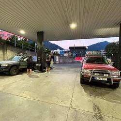 Nach der letzten Piste wurde Stopp an einer Tankstelle gemacht, um wieder den entsprechenden Luftdruck für eine Autobahn-Fahrt auf den Reifen zu haben.🌬️🛞 Nun geht es auf die Autostrada nachもっと詳しく