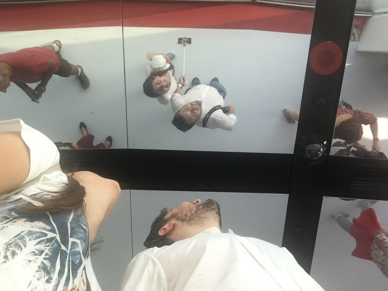 Per la grande gioia di Matt abbiamo scoperto - proprio davanti agli ascensori e un attimo prima di andarcene - che anche a questo piano c'è una piccola parte di pavimento in vetro! Tutto contento si è fatto un video ai piedi che camminavano sul vetro con le macchine e i pedoni piccolissimi 300m più in basso.