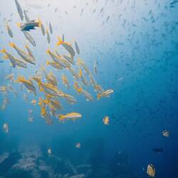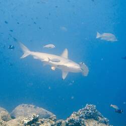 Als wir zum dritten Tauchgang aufbrechen sehen wir bestimmt 100 Delfine, allerdings gesellen sie sich unter Wasser nicht zu uns. Und Delfine heißt keine Orcas mehr. Aber Grund zur Beschwerde gibt es trotzdem nicht. Erst tummeln sich an der Riffkante etliche Hammerhaie und dann sehen wir noch eine Schule von mehr als 100 Stück um uns herum als wir Richtung safety stop schwimmen. Definitiv ein Beeindruckendes Erlebnis!