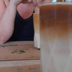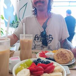 We arrived later than planned, but still too early for the hotel. The room was ready so we were lucky and could check in already. We went out for breakfast and close by was some "health food" restaurant with pancakes, waffles, hamburgers, icecream and cake on the menu. 😅 eike picked pancakes with fruit, and nina a fruit salad with granola, honey, choco peanut butter, and yoghurt.