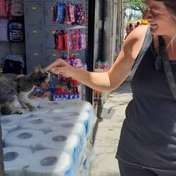 We woke up and got ready to go to the airport. We got picked up at the hotel, picked up two more people, and went to the airport. Eike got 3 tickets, one to use the airport (30 soles), one for taxes (49 soles) and the actual airplane ticket (84 dollars). He left and Nina got a coffee and started on the penguins again. A woman came back from a flight and she was very pale and had to sit down. Nina was wondering how Eike was doing in the little airplane 🤭