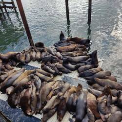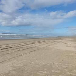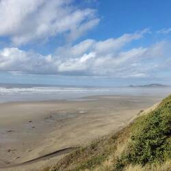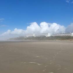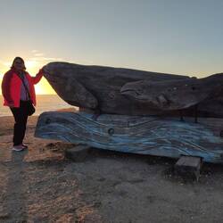 Weitläufiger breiter Strand auf der einen Seite, Fischereihafen mit sehr lautem Seelöwenrudel auf der anderen Seite