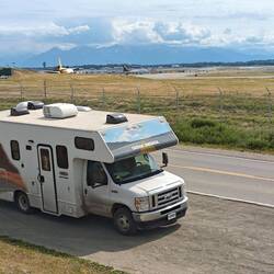 Abwasser entleeren, Frischwasser tanken. Benzin und Propangas nachfüllen. Zieht sich sich alles ziemlich hin.