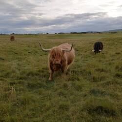 Zwischen Campingplatz und Strand befindet sich ein Golfplatz auf dem Schafe und schottische Hochlandrinder unterwegs sind.