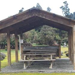 The campground has four flush toilets 🚻, plus a covered shelter with a table and benchLue lisää