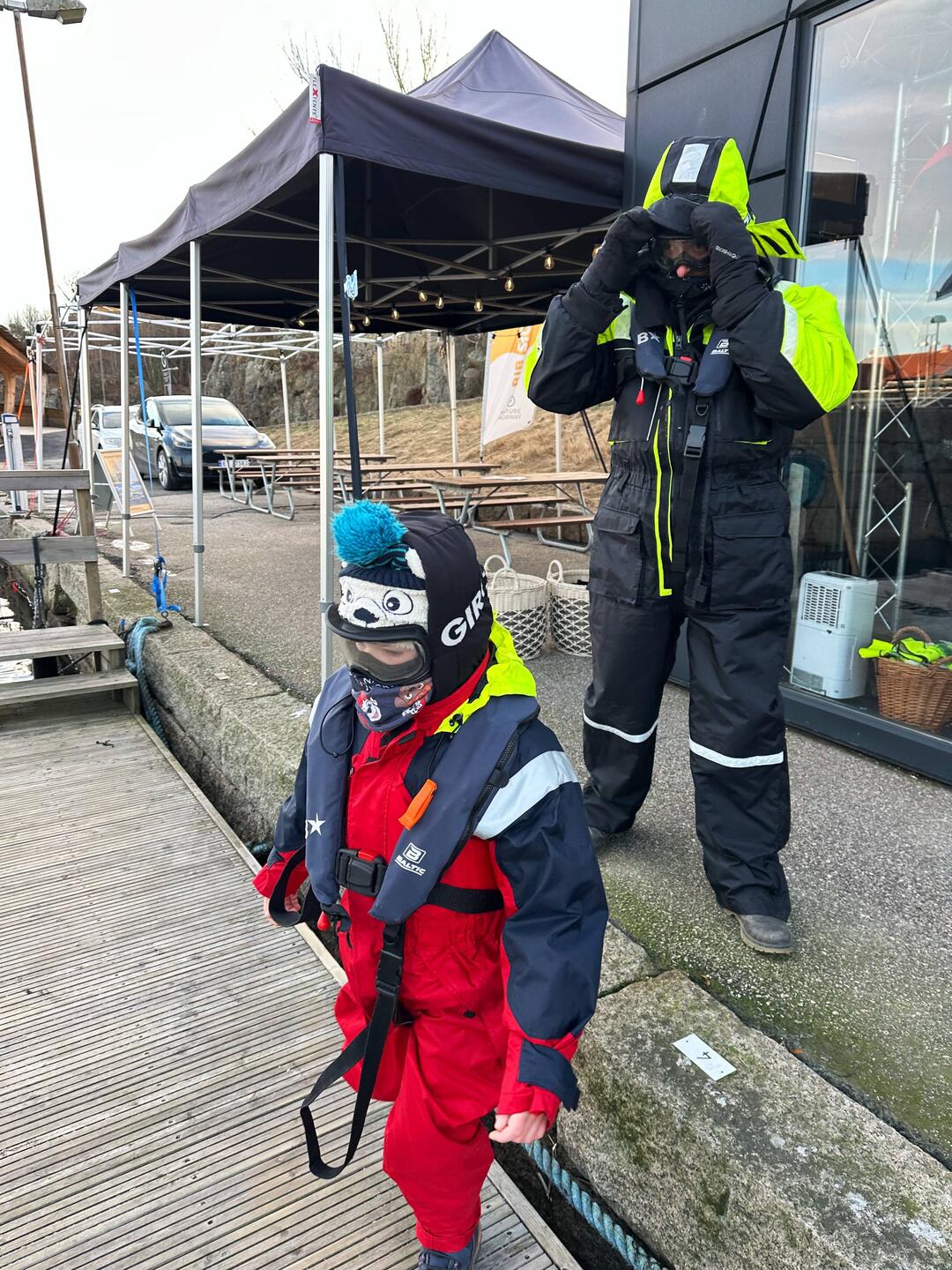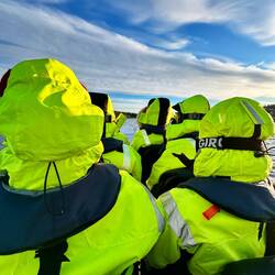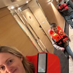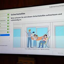 Die Seenotrettungsübung erfolgt inzwischen digital. Auf der Kabine schauen wir uns das Video an und marschieren dann, bewaffnet mit unseren Schwimmwesten, zu unserer Masterstation um uns abhaken zuLæs mere