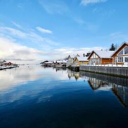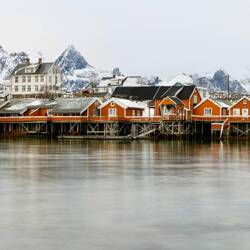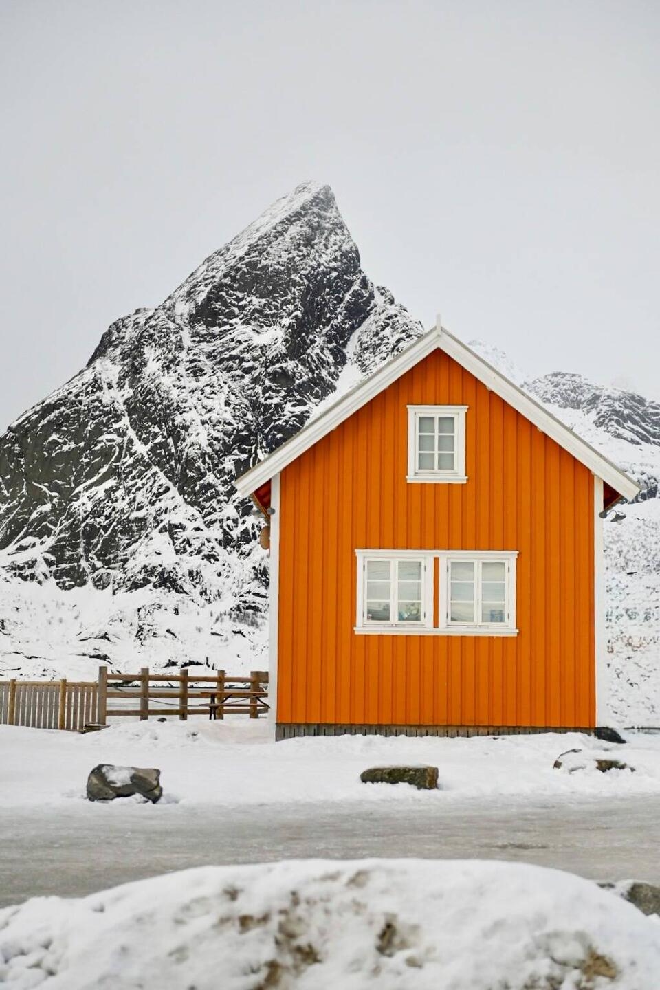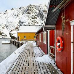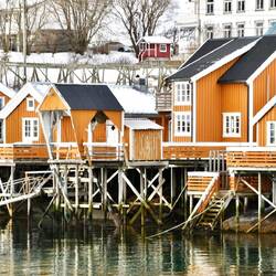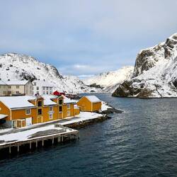 Dieser kleine überschaubare Ort bringt mit seinen gelben Häuschen direkt ein bisschen Abwechslung zu den sonst roten Fischerhütten.