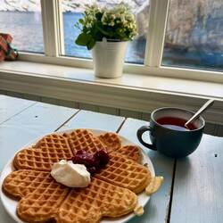 Während draußen der Schneesturm tobt genießen wir im muckeligen warmen Frühstückssalon das Buffet. Es ist super lecker, vielfältig und extrem liebevoll hergerichtet.