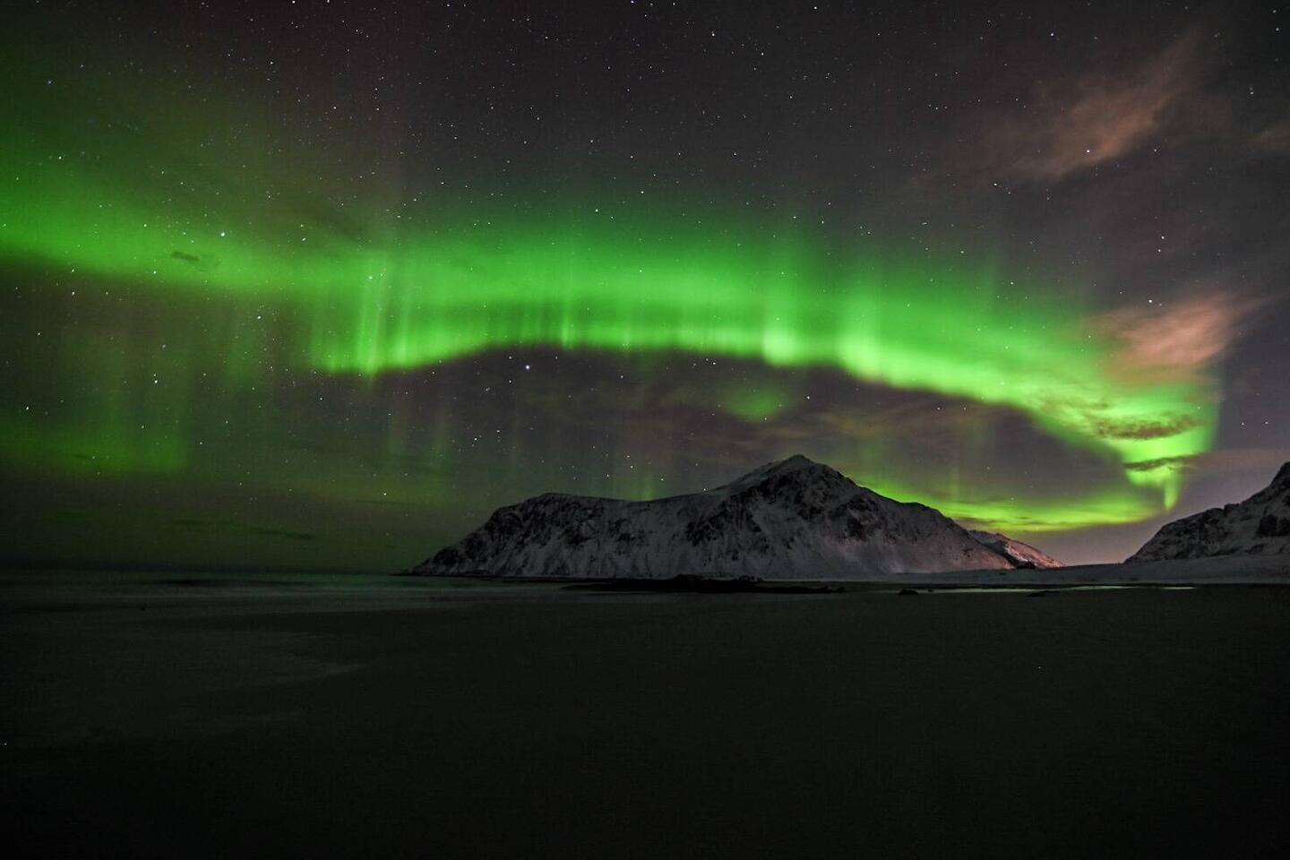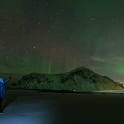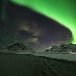 Pünktlich zum Sonnenuntergang (16:35 Uhr) treffen wir am Haukland Beach ein.