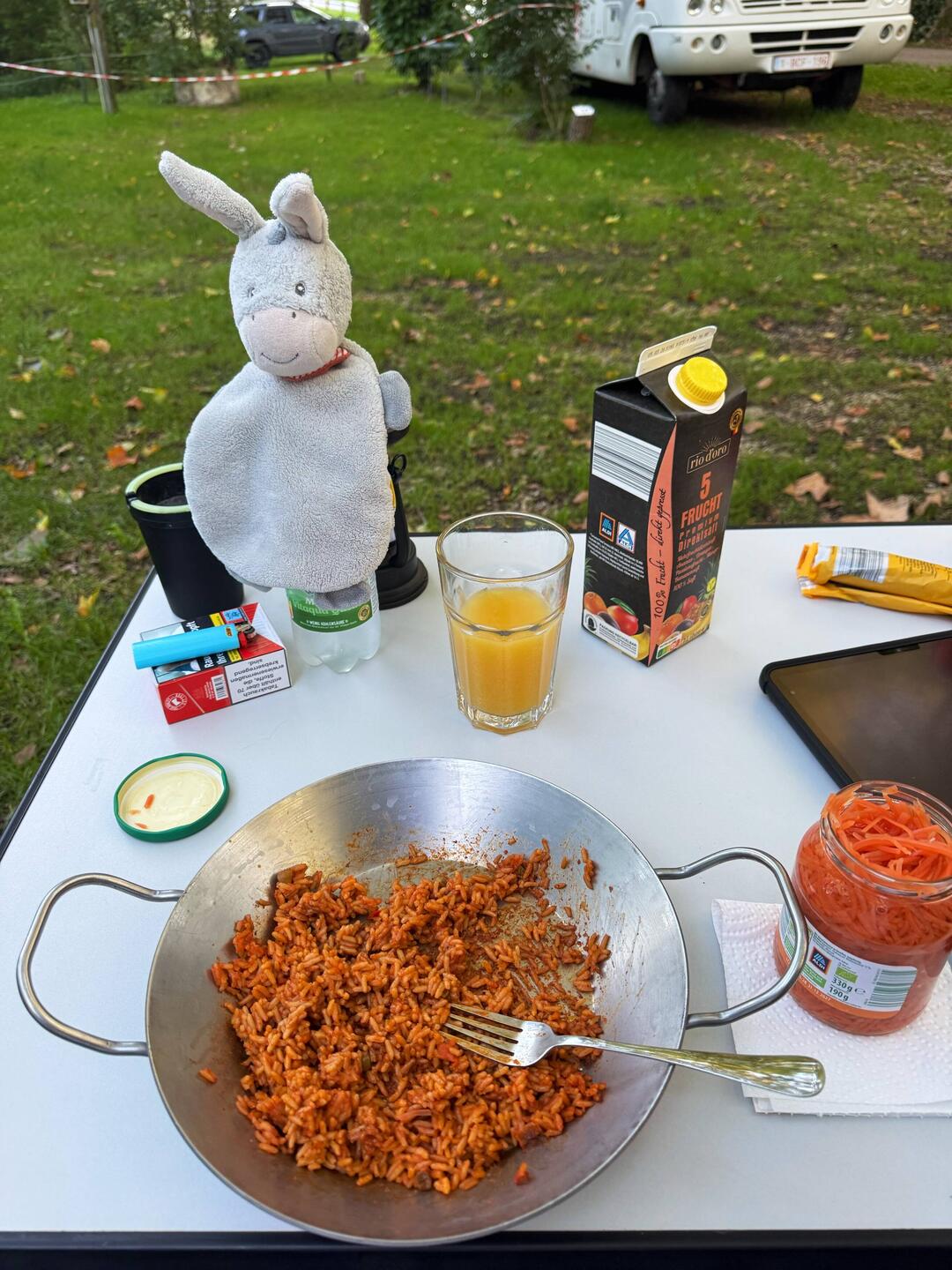 Es gibt eine vorzüglichen Djuvekreispfanne mit Karottensalat aus dem Glas.