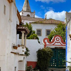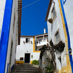 Wind aside we enjoy the sun when we reach the third coastal town called Óbidos. Óbidos is truely a postcard destination! It is one of Europe’s best-preserved walled medieval towns and the cheerful colour combination of white, yellow and blue used on the houses gives it a welcoming look. Welcoming enough for us to go for a long stroll around and to enjoy a lunch in the sun at one of the little squares in town. It’s definitely our favourite out of these four towns.