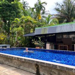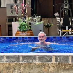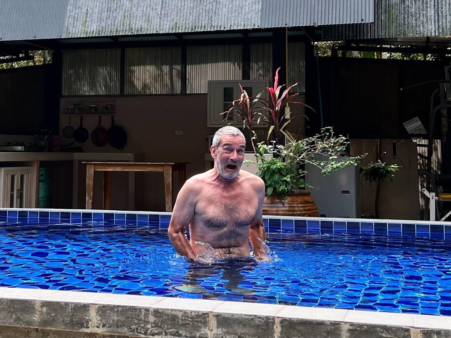 Es war heute wieder richtig warm. Ich habe meinen Fuß auf der Poolliege entspannt, Frank hat sich im Wasser abgekühlt.
