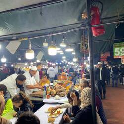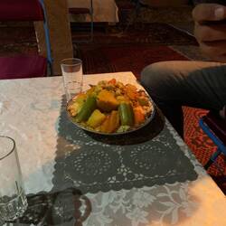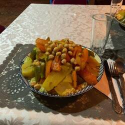Ein Erlebnis. Frank hatte Couscous mit Hühnchen und ich vegetarisch. Da war u. a. ein halber Kohlkopf mit drauf. Die Portion hätte locker für 6 Personen gereicht. Wir haben unseren Kochtopf geholtもっと詳しく