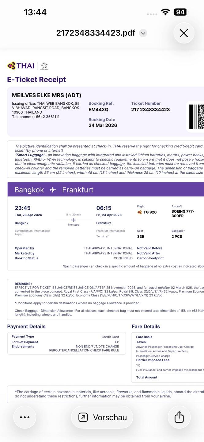 Wir haben einen Direktflug gebucht. 23.04. von Bangkok nach Frankfurt. Sogar bezahlbar 💃
