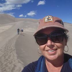 Hiking through sand is hard work! I'm used to waking the beach, but I usually walk the packed part of the sand and it's NOT uphill. They say it can be up to 60 degrees hotter on the sand. I was working up a sweat, but I wouldn't say it was hot. The higher the elevation, the temperature was dropping and the wind was getting stronger. I was walking along this narrow ridge. There were sand boarders riding down the ridges, walking back up and then riding down again. There was a young couple from Denver who asked me to take their picture. There was a couple carrying their Collie down the rim. Another couple had their baby on back and walked right past me. I was out of breath. It was not only hard work but at a high elevation and I was out of breath.