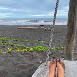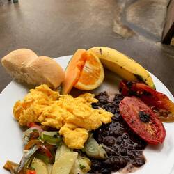 Start in den Tag: Jetlag mit leckerem Frühstück mit Aussicht auf einen Vulkan, der heute natürlich in den Wolken war 🤷🏼♀️