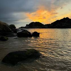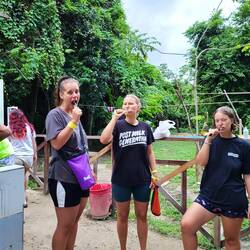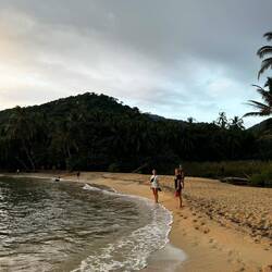 Der Weg windet sich an der Küste entlang, ab und zu erspähen wir durch die Bäume das Meer. Der Farbkontrast sieht aus wie Photoshop: grüner Regenwald, türkises Wasser, weißer Strand und blauer Himmel. Ein paar Schwimm-, Eis-, Bier- und Fotopausen später erreichen wir den Strand, wo wir übernachten. Wir planschen im Wasser und spielen mit unserem Wasserball. Noch ein paar (äußerst amüsante) Runden UnoFlip und dann geht’s schon in die Hängematten. Ich schlafe besser als gedacht.