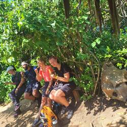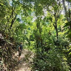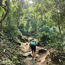 Nach Sonnenaufgang, Frühstücks-Uno und einem letzten Mal planschen inkl. Felsenkletterei sind wir auf dem zweiten Teil der Wanderung. Dieser Abschnitt der Strecke ist wenig begangen, der Weg ist schmal und wild, es geht hoch hinaus, wir zerlaufen. Das finale Stück legen wir mit Motorrad-Taxis zurück. Die Fahrer sind abgebrühte Profis, wir haben bei der Abfahrt Adrenalin im Blut.