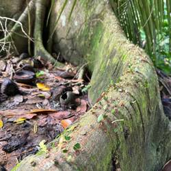 Das erste Highlight passiert gleich am Anfang: Wir sehen einen Brüllaffen, der uns neugierig beobacht. Kurz darauf gesellt sich ein zweiter dazu, nach wenigen Minuten sind es sechs. Wir freuen uns, dass sie so viel Interesse an uns haben, bis wir den Grund realisieren: 3 Bananen in der Außentasche von Claudias Rucksack. Unsere Lösung? Den Grund ganz schnell aufessen.