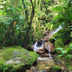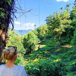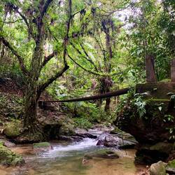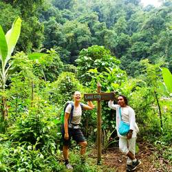 Die Landschaft ist übersäht von grünen, spitzen Bergen, Bäumen mit Lianen und in der Ferne sieht man das Meer. Wir laufen über Schotterstraßen, Waldwege und Bäche, klettern über Felsen oder Matschpassagen und, vor allen Dingen, geht es ziemlich viel hoch, gefühlt selten runter.