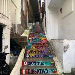 Heute ist der touristische Teil der Comuna geprägt von bunter Straßenkunst, Kleinkünstler*innen, Souvenir- und Snackläden, Bars mit lauter Musik und endlosen Motive für das perfekte Instagram Bild. In diesem touristischen Treiben finde ich meine Abenteuerlust in den Seitenstraßen. Ich komme mit einer lokalen Künstlerin ins Gespräch und erweitere meinen Souvenirbestand.